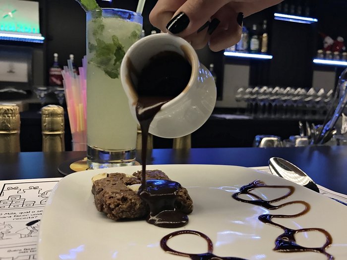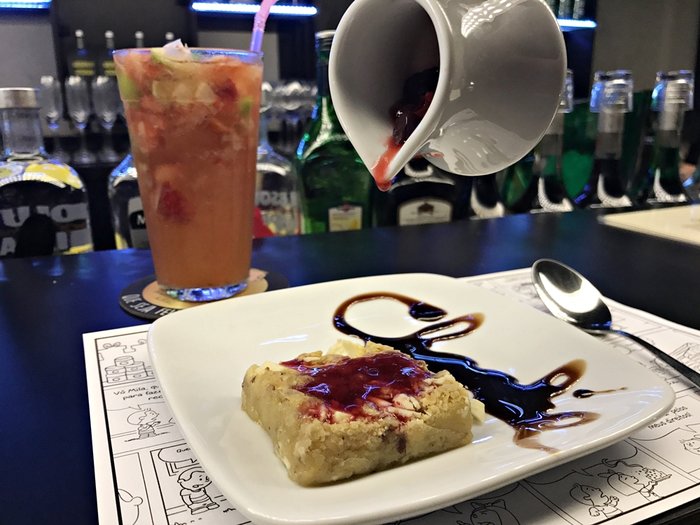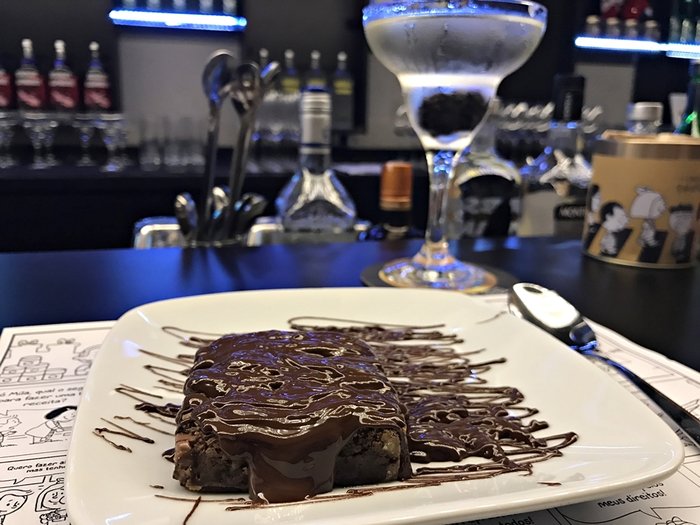 Antes de qualquer coisa, vou explicar um pouco o conceito: brownies e drinks (ou cervejas, como preferir). No cardápio, os coquetéis preferidos de pessoas que são importantes na vida do Tiago, e levam até seus nomes. Nada muito elaborado para este início, mas com sabores que se destacam. O melhor de tudo são as sugestões de harmonização com os brownies e outros doces da casa.