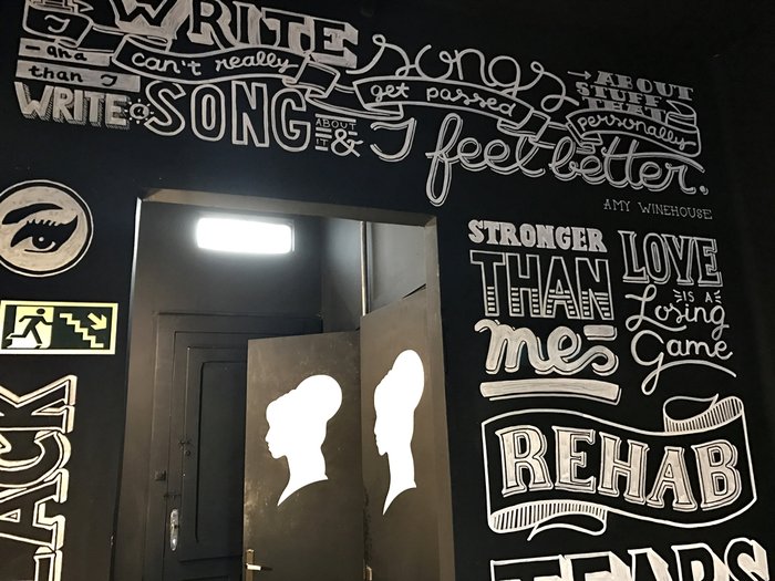 É ousado, com certeza. E pode até parecer estranho à primeira vista, mas achei a ideia genial. Para quem achar que falta um salgado, potes com amendoim estão espalhados pelo pub. Que, aliás, tem muito a cara do Tiago, fã de Amy Winehouse. Olha a entrada para o banheiro!