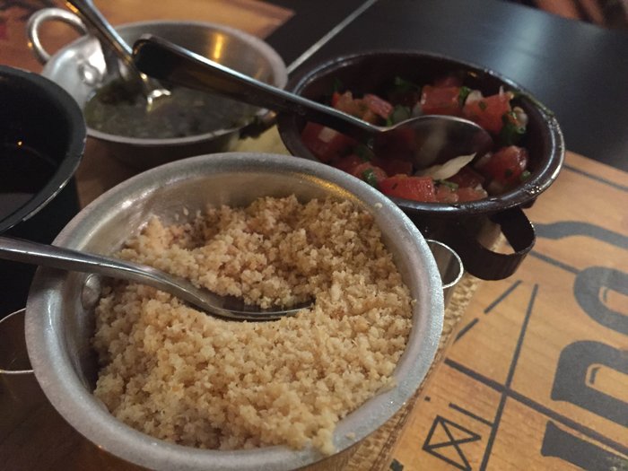 Os acompanhamentos são os tradicionais, feitos com qualidade: vinagrete, farofa de alho e o molho chimichurri.