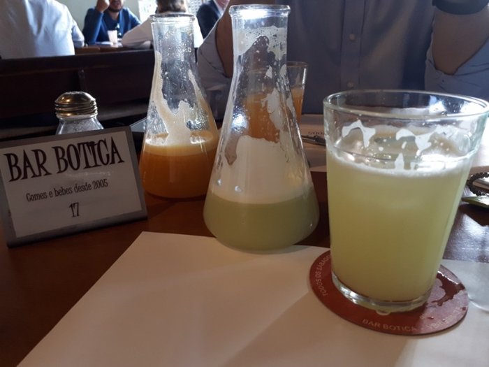 Para começar, pedimos um suco de laranja e uma limonada que são servidos em charmosas jarras tipo erlenmeyer (essa eu tive que jogar no Google pra descobrir o nome).