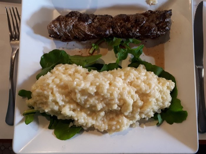 Devo dizer que minha amiga também acertou no pedido quando escolheu o filé clássico à Trança de Mignon com risoto de manga e rúcula, mas sem manga, porque ela não é diferentona. E o prato estava maravilhoso, de comer sem nem olhar para o lado.