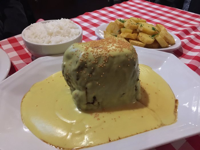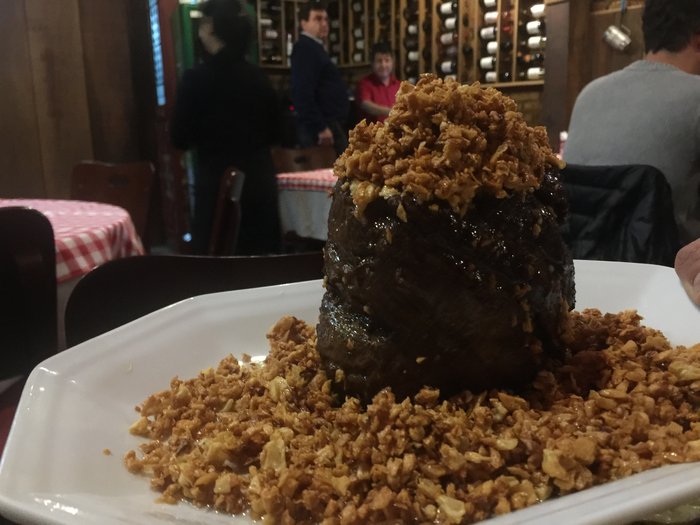 - De prato principal: grande parte dos pratos principais são para duas pessoas, porém, como são porções muito bem-servidas, facilmente servem três pessoas com fome. Os filés são os clássicos e a média de preço deles ficam em torno de R$ 90. Também provamos o filé grelhado ao molho mostarda, com batata sautée e arroz, um filé com 600g - e com uma altura gigantesca! Cortado de colher para certificar a maciez da carne. Uma delícia! (R$ 96,00). Filé Rahm Schnitzel, um filé à milanesa ao molho de nata, com arroz e fritas, de comer ajoelhado (R$ 90,00).