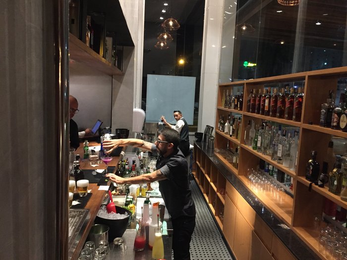 - Bem na entrada do restaurante, ao lado da adega um bar bem montado de onde saem drinks e coquetéis criativos.