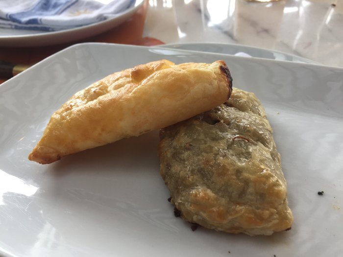 As deliciosas empanadas da casa: uma de carne e outra de queijo e alho poro, a R$ 10,00 cada.