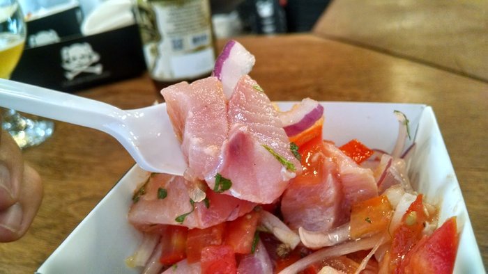 No mercado de Pinheiros, uma parada certa nas suas comprinhas pra um bom lanchinho é essa banquinha! Com o menu variado e um ceviche sempre fresco, vale a pena conferir o que eles estão aprontando naquele dia. As opções ficam marcadas na clássica lousa logo acima dos atendentes.