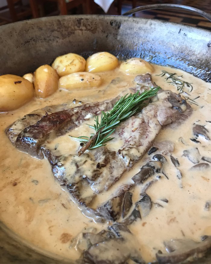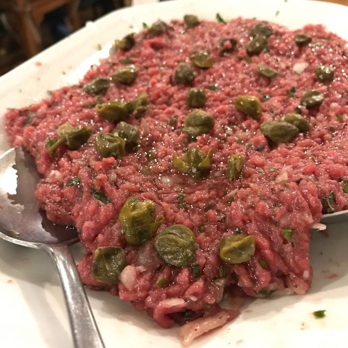 Nossa sugestão é o clássico steak tartar com alcaparras, uma das especialidades da casa, que é montado na mesa pelos garçons. De sobremesa, é oferecida uma bandeja de docinhos muito saborosos.