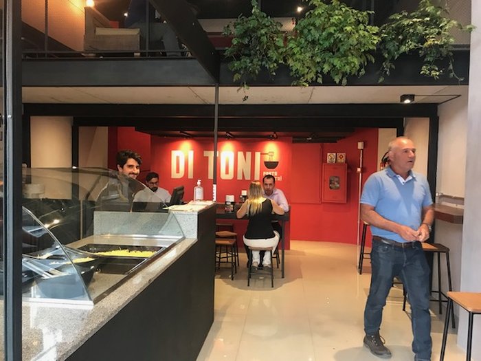 O Di Toni tem dois andares, ambos com poucas mesas. Algumas mesinhas para duas ou quatro pessoas e outras maiores, para compartilhar. Ah, um baita ponto que nos chamou a atenção e que mostra que os donos pensaram em tudo para agradar a clientela: as mesas tem tomadas. Mais um ponto positivo: você paga R$2,10 e se serve à vontade de chá gelado - ou, se preferir, também dá pra pegar água FREE direto do filtro.