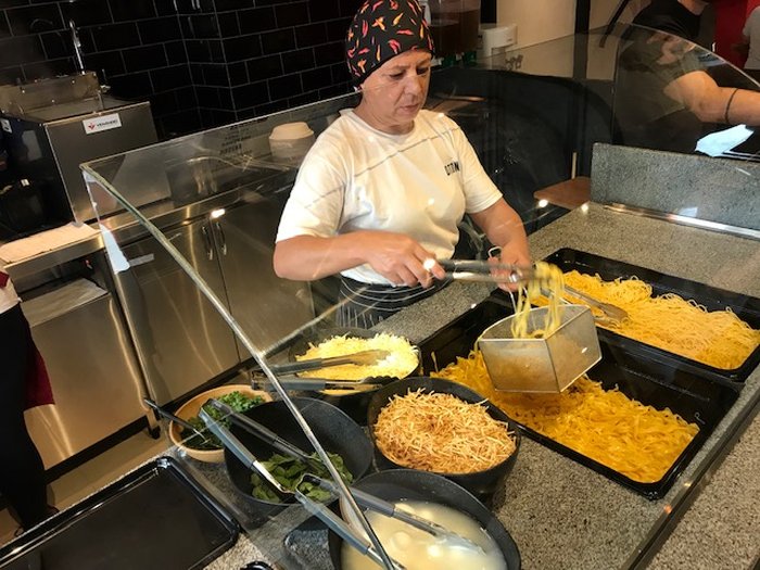 O esquema da casa é jogo rápido: você chega, pega uma mesa, vai pro caixa, escolhe uma das seis opções de massas (ou saladas), espera pouquíssimos minutos e já sai com o prato prontinho na bandeja. É mais rápido que muitos fast foods por aí. As massas são produzidas diariamente por eles mesmo, e ficam no balcão pré prontas, então é só o tempo de eles jogarem na água quente e misturarem com os molhos. É rapidão mesmo, o que faz todo sentido em um bairro como o Centro, onde os almoços, muitas vezes, devem ser mais na correria.