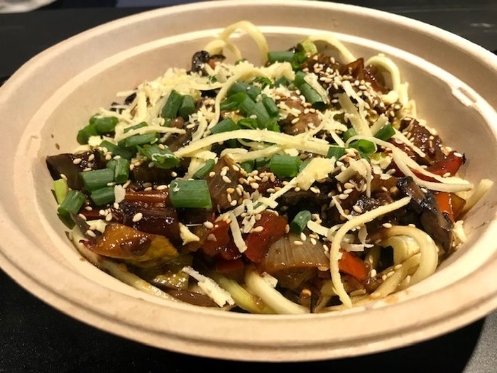 A massa dessa foto é a Veggie Deli (R$15,90), que foi a minha escolha: legumes salteados ao molho teryaki e gergelim sobre um spaghetti de abobrinha. O tempero é mais fortinho e vem bastante vegetais, eu gostei bastante.