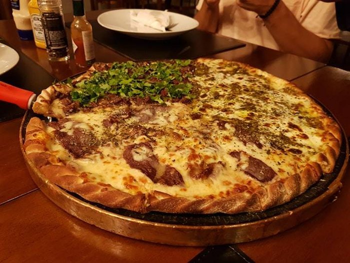 Optamos por pedir uma pizza grande com 3 sabores: filé dos pampas, picanha gaudéria e mozzarela al pesto (R$ 74), confesso que ficou difícil escolher a predileta, todas eram delíciosas. A massa era crocante e fininha, não tenho nem palavras para descrever o recheio, tudo de melhor qualidade - não é à toa que não sobrou um pedaço sequer.