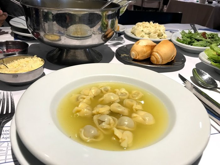 O rodízio da Nonno Mio, em Gramado, inicia com a famosa sopa de capeletti servida em prato quente. Difícil não querer repetir a dose.