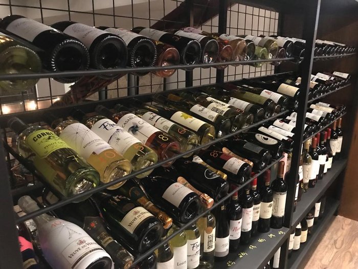 Depois de caminharmos e escolhermos uma mesa, foi hora de fazer o pedido. Tem um tablet na mesa, mas também tem opção de escolher os vinhos na prateleira mesmo, já vê o rótulo, valor e coloração do vinho.