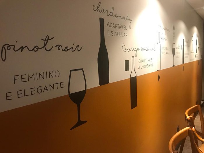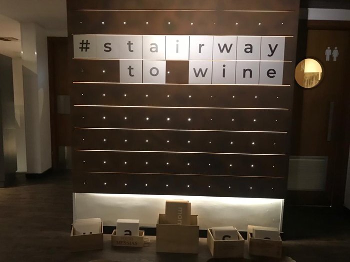 O winebar fica no mezanino do Restaurante Victor, da Praça Espanha. Ao chegar, ficamos fotografando incansavelmente a escada de acesso ao lugar. É de uma criatividade, cada degrau tem o nome de uma uva e o que mais encanta é uma chuva de taças de vem do teto.