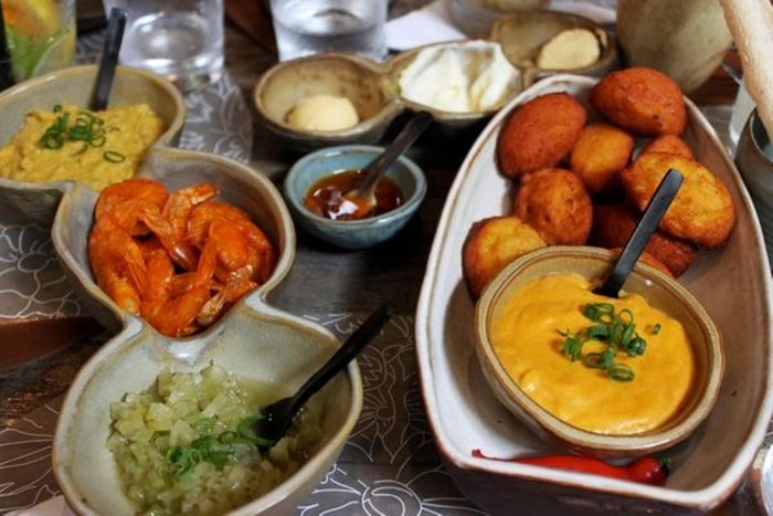 Ao chegar no Brasil a gosto você de cara percebe que vem coisa boa pela frente. Se a rua é gostosa daquele jeito, o que sai da cozinha não deve ser pouca coisa. Tudo que chega à mesa é de dar gosto. O cardápio de entradas e petiscos é bem sugestivo. Mas relaxe, você não vai conseguir chegar nem na metade. Osmini acarajés com camarões, vatapá, caruru, pimenta e pesto de tomates verdes não dão a você a menor possibilidade de pensar em pedir outra coisa.