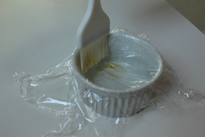 1. Corte um quadrado de 25cm de plástico-filme e coloque-o dentro de um pote de cerâmica. Depois, unte o plástico com um pouco de óleo.