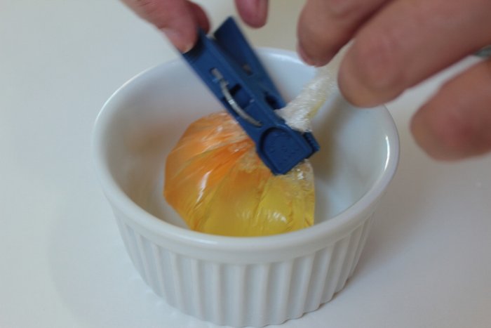 4. Junte as pontas do plástico, enrole e prenda com um prendedor de roupa.