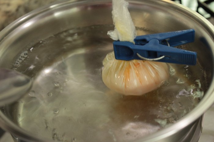 7. Com uma escumadeira, transfira o ovo, ainda no plástico, para uma tigela com água fria para facilitar a abertura. Tire a trouxinha da água.