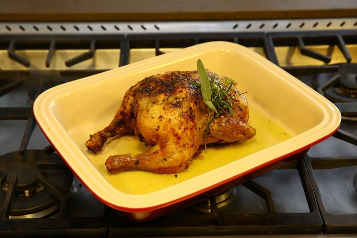 8. Leve o frango ao forno em uma assadeira e asse por 4 horas ou até que esteja cozido (isso vai depender do tamanho do frango).