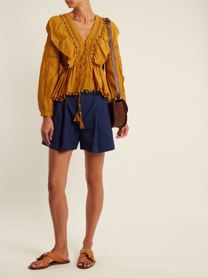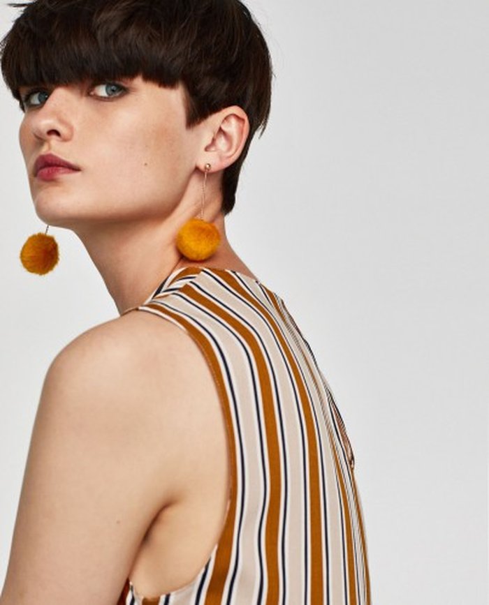 Os maxi brincos não ficam de fora, assim como colares ou braceletes, todos garantem um ponto de luz ao look! Reparem como a cor funciona bem com os outros tons terrosos presentes na blusa: