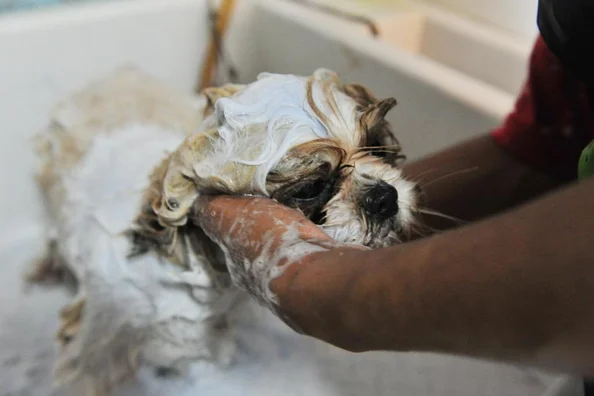 A cabeça é a última parte a ser lavada e deve ser a primeira a ser enxaguada. Quanto ao corpo, passe xampu e enxágue duas vezes. Havendo necessidade, use condicionador, mas pouquinho. Cuidado que excesso de creme deixa o pelo com aspecto muito oleoso.