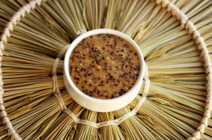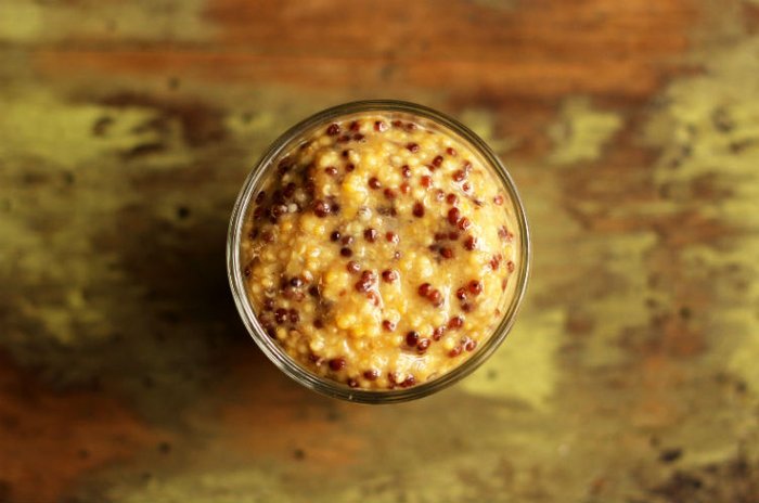 Coloque as sementes de mostarda dentro de um vidro que possua tampa, cubra com a primeira quantidade de vinagre e misture bem. Tampe e deixe em temperatura ambiente por três a cinco dias. Quanto mais tempo deixar a mostarda, ficará mais forte.