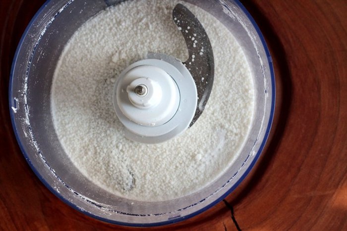 Coloque o arroz no processador de alimentos e bata bem para quebrar muito bem os grãos (veja a foto abaixo). Durante o processo abra o processador e mexa para garantir um bom resultado.