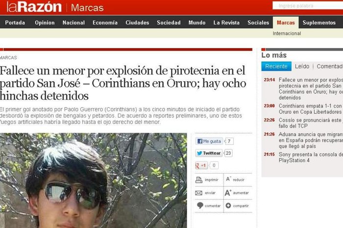 Na partida entre San José e Corinthians, que empataram em 1 a 1 na noite desta quarta-feira, na Bolívia, pelo Grupo 5 da Copa Libertadores, um torcedor local morreu ao ser atingido por um sinalizador que teria sido arremessado por corintianos depois que o time brasileiro abriu o placar da partida, com Paolo Guerrero, aos cinco minutos do primeiro tempo.
