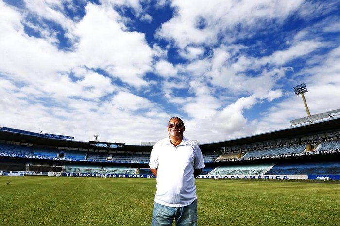 No dia que se ensolarou de repente, o centroavante dos anos 60 e 70 olhava para as arquibancadas do lugar que o consagrou e contava histórias. Aceitara um convite de Zero Hora e fazia a visita de despedida ao estádio que deve ser implodido até o meio do ano.