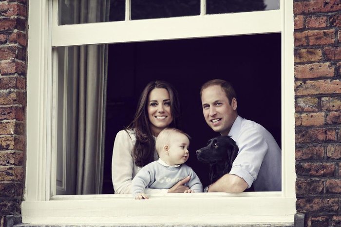 Aos oito meses, o príncipe aparece ao lado dos pais, William e Kate, assim como do cachorro Lupo, na janela da residência de Kensington Palace, onde mora a família.