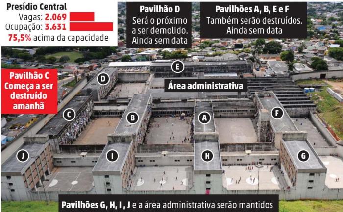 A demolição do pavilhão C começa na terça-feira. Depois, será derrubado o pavilhão D. Ficarão de pé, a administração, a cozinha geral e os pavilhões G, H, I e J, construídos em 2008 com espaços para 720 presos. Até o final de 2015, deverão ser construídos novos pavilhões, elevando a capacidade para 1,5 mil presos provisórios (sem condenação).