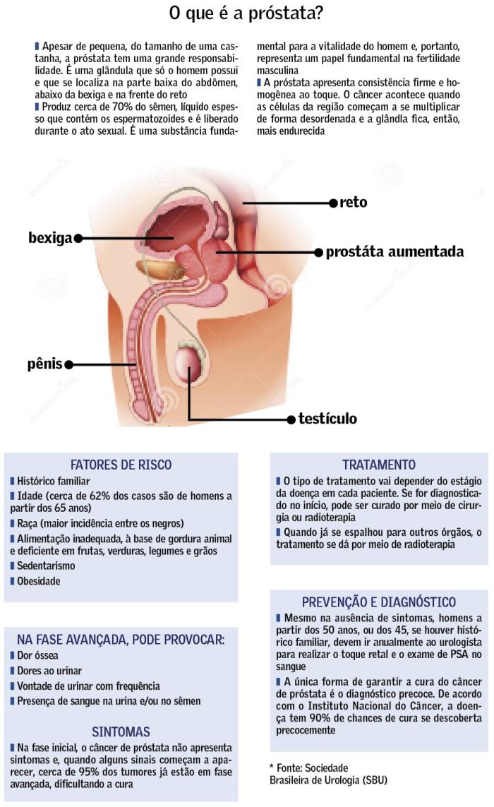 Integrante do aparelho reprodutor masculino, a próstata se localiza abaixo da bexiga, tem a função de, juntamente com as vesículas seminais, produzir o esperma. A glândula normalmente começa a aumentar de tamanho a partir dos 40 anos - crescimento que pode ser confundido com o causado pelo câncer, quando células mutantes se multiplicam de forma desordenada.