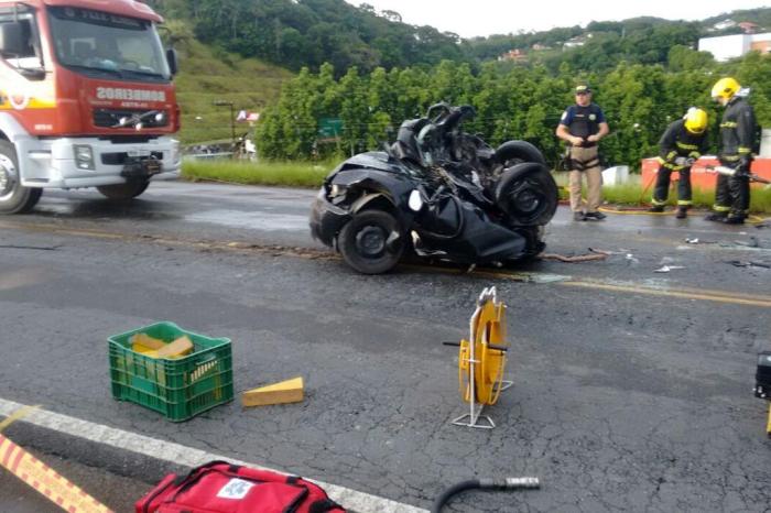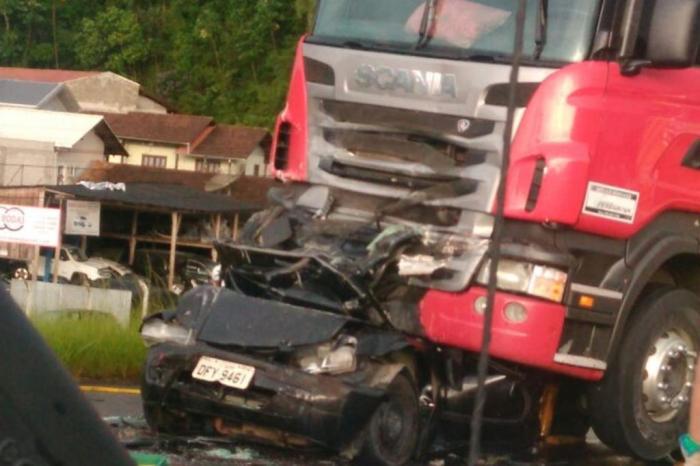 Duas mulheres morreram em um acidente no Km 49,5 da BR-470, próximo ao trevo de acesso ao bairro Fortaleza, em Blumenau. A colisão ocorreu por volta das 17h50min desta terça-feira. Segundo informações da Polícia Rodoviária Federal (PRF), um automóvel Celta preto, com placas de Gaspar, foi atingido na traseira por um caminhão Scania R380, com placas de Morro da Fumaça. O impacto prensou o carro com outro caminhão, um Scania T113, de Botuverá, que estava na frente do Celta.