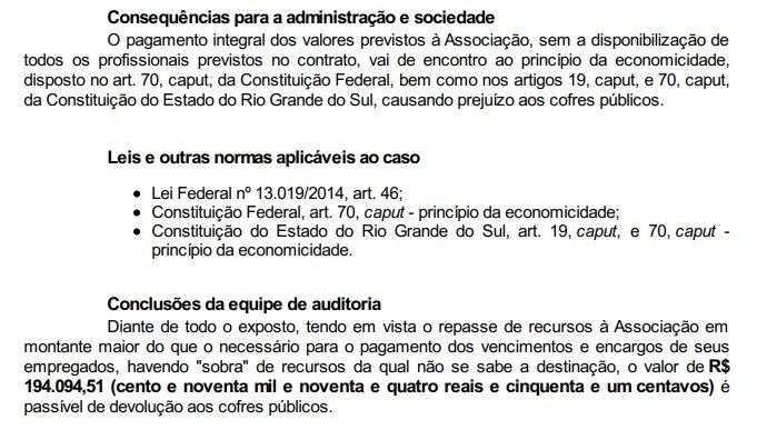 "O procedimento adotado pelo Executivo, de aceitar propostas com preços claramente superiores aos de mercado, vai de encontro ao princípio da economicidade", diz o relatório. Segundo a auditoria, mais de R$ 500 mil foram pagos pela prefeitura em excesso à Silvio Scopel. O caso segue em tramitação. No pleno do TCE, caso sejam ratificadas as irregularidades, poderão ser determinadas punições aos gestores municipais, como a devolução de dinheiro ao patrimônio público.
