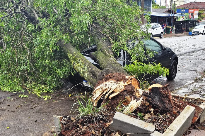 Na Rua Livramento, bairro Boqueirão, uma árvore caiu sobre um Ford Ka estacionado. A via está bloqueada. O veículo pertence ao carpinteiro Vinícius Almeida, que trabalhava em uma obra em frente ao local quando a queda aconteceu.