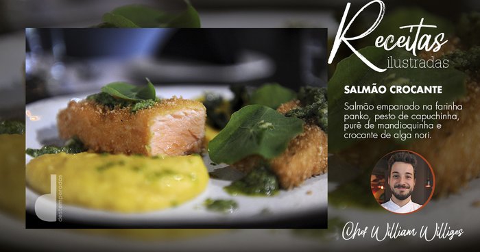 Na sexta edição do Receitas Ilustradas, o chef William Williges ensina a fazer um salmão empanado na farinha panko, acompanhado de pesto de capuchinha, purê de mandioquinha e crocante de alga nori.