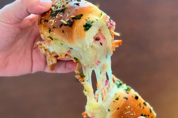 2 Comece a montar o sanduba pelo frango desfiado, cuidando para que todos os pães fiquem recheados.