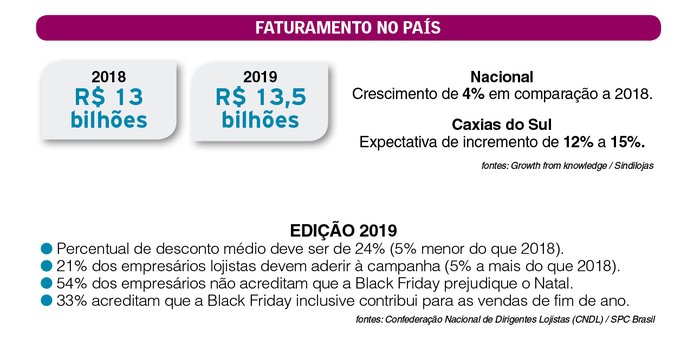 A Câmara de Dirigentes Lojistas de Caxias do Sul (CDL) não divulgou projeções consolidadas do desempenho do comércio neste ano na Black Friday. Porém, para o presidente da entidade, Ivonei Pioner, todos os indicadores sinalizam para uma boa prospecção: