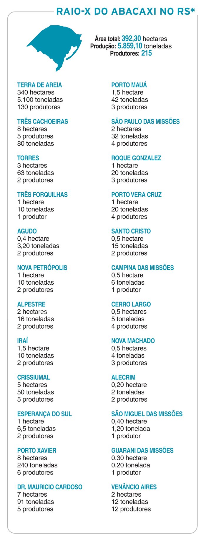 Com 350 hectares de área dedicada ao plantio do abacaxi, o município litorâneo é responsável por 97% da produção comercial, conforme o assistente técnico da regional da Emater de Porto Alegre, Luis Bohn. Há outras 24 cidades produtoras de abacaxi no RS, mas o volume é bem inferior. Guarani das Missões, por exemplo, produziu apenas 0,20 tonelada (200 quilos) em 2017 — e tinha um único produtor.