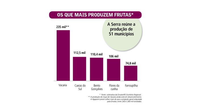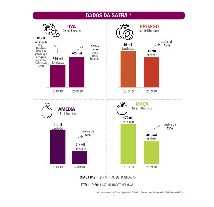 A safra de frutas na Serra gaúcha vai render menos em 2020. Estimativa prévia da Emater/RS indica que a colheita 2019/2020 deve ter queda de pelo menos 6% em comparação com a safra passada. A previsão _ extraoficial _ é colher 70 mil toneladas a menos nas culturas uva, pêssego, ameixa e maçã, as principais cultivadas da região. A colheita passada rendeu 1,217 milhão de toneladas. Nesta, a previsão é de 1,147 milhão. No caso da ameixa, a quebra chega a 70% em algumas propriedades.
