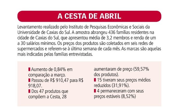O presidente do Sindicato do Comércio Varejista de Gêneros Alimentícios de Caxias do Sul (Sindigêneros), Eduardo Slomp, nega que o mês de abril tenha sido de aumento na cesta básica. Embora não apresente pesquisa, ele informa que itens citados no estudo do Ipes não procedem com a realidade do mercado.