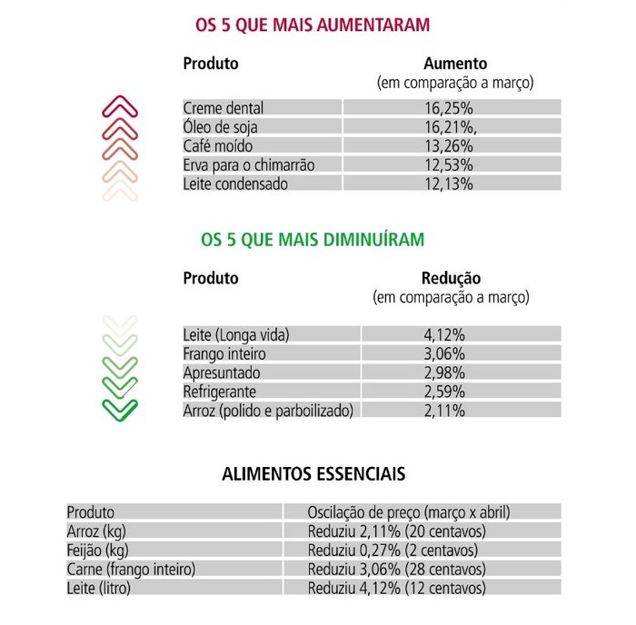 Os produtos que mais aumentaram no período foram creme dental (16,25%), óleo de soja (16,21%), café moído (13,26%), erva para chimarrão (12,53%) e leite condensado (12,13%). Já as maiores reduções foram constatadas no leite (-4,12%), frango (-3,06%), apresuntados (-2,98%), refrigerante (-2,59%) e arroz (-2,11%). Porém, como se percebe, os índices de redução foram bem menores do que o dos aumentos. Além disso, segundo Birch, mesmo as reduções de itens como carne e leite não compensam os recentes aumentos que os produtos vinham sofrendo.