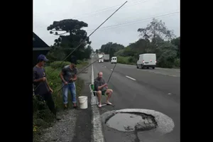 Cansados de esperar por uma solução quanto à má conservação da ERS-122, moradores do distrito de Nova Milano, em Farroupilha, realizaram um protesto inusitado na segunda-feira (6). Pouco antes das 13h, o açougueiro Valdoir Maioli, 26 anos, o irmão, Vantoir Maioli, e o tio, Gilmar Fraitag, 49, simularam uma pescaria em um buraco no km 52 da rodovia.