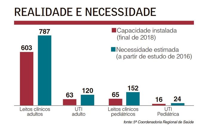 Estudo feito pela 5ª Coordenadoria Regional de Saúde (CRS), com sede em Caxias do Sul, aponta que existem menos leitos que o necessário nos hospitais que atendem pelo Sistema Único de Saúde (SUS) na Serra. Usando como referência o mês de dezembro de 2018, a diferença entre a quantidade disponível e a necessária, calculada com base em portaria federal, é de 336 vagas a menos. Os 49 municípios abrangidos pelo órgão estadual têm cerca de 1,4 milhão de moradores. Chama atenção especificamente o dado relativo ao atendimento de crianças: enquanto a região tem 65 leitos clínicos pediátricos, o ideal seriam 152. Nas Unidades de Tratamento Intensivo (UTI) para os pacientes infantis, são 16 vagas enquanto seria preciso 24.