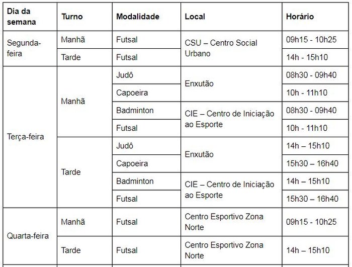 Locais: Centro Social Urbano (CSU), Ginásio Enxutão, Centro de Iniciação ao Esporte (CIE) e Centro Esportivo Zona Norte