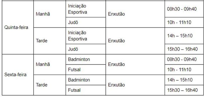 Confira abaixo horários, dias e locais das atividades dos programas: