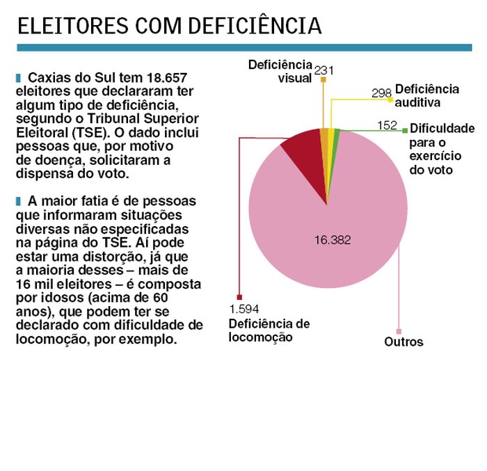 Dos 322.901 eleitores aptos a participar das eleições deste ano em Caxias do Sul, 18.657 declararam ter algum tipo de deficiência, segundo o Tribunal Superior Eleitoral (veja no gráfico). Conforme o chefe do Cartório da 169ª Zona Eleitoral, Edson Borowski, a Justiça Eleitoral tem trabalhado nos últimos anos para reduzir as barreiras que estão no caminho entre o cidadão e o voto. No início deste ano, encabeçados pelo Ministério Público Federal (MPF), o Conselho Municipal dos Direitos da Pessoa com Deficiência e o Centro Universitário da Serra Gaúcha (FSG) fizeram um levantamento em 32 prédios do total de 58 locais que concentram a maior parte dos eleitores com deficiência na cidade, cerca de 70%.