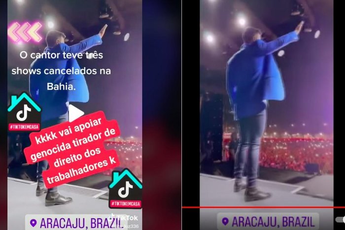 Conteúdo investigado: vídeo no TikTok mostra o cantor Gusttavo Lima em show enquanto plateia grita “Ei, Bolsonaro, vai tomar no c*”. É possível ler na peça as seguintes frases: “O cantor teve três shows cancelados na Bahia”, “vai apoiar genocida tirador de direitos dos trabalhadores” e marca a localização como sendo em Aracaju, “Brazil”.