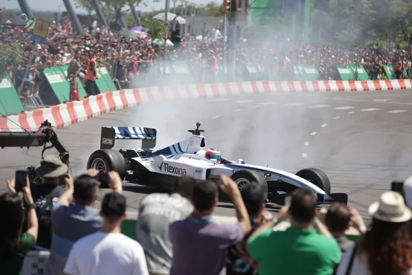A primeira aparição de Barrichello na pista de 600 metros montada na orla do Guaíba ocorreu pouco depois das 11h. Ele deixou a garagem semiaberta (da área VIP, era possível enxergar a preparação do piloto) montada à altura da rótula da Avenida Augusto de Carvalho para ir e vir pela pista que se estendia até pouco depois da Usina do Gasômetro por três vezes. Bem mais lento do que a capacidade da Fórmula-1 — que, na velocidade máxima, percorreria a distância em apenas 10 segundos —, Rubinho demorou cerca de 30 segundos em cada trecho, marcado por derrapagens que divertiam o público, levantando poeira nos extremos da pista.